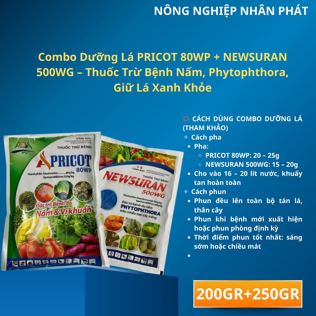 Combo Dưỡng Lá PRICOT 80WP + NEWSURAN 500WG là bộ thuốc trừ bệnh chuyên dùng để phòng và trị các bệnh do nấm và nấm giả gây hại trên cây trồng.